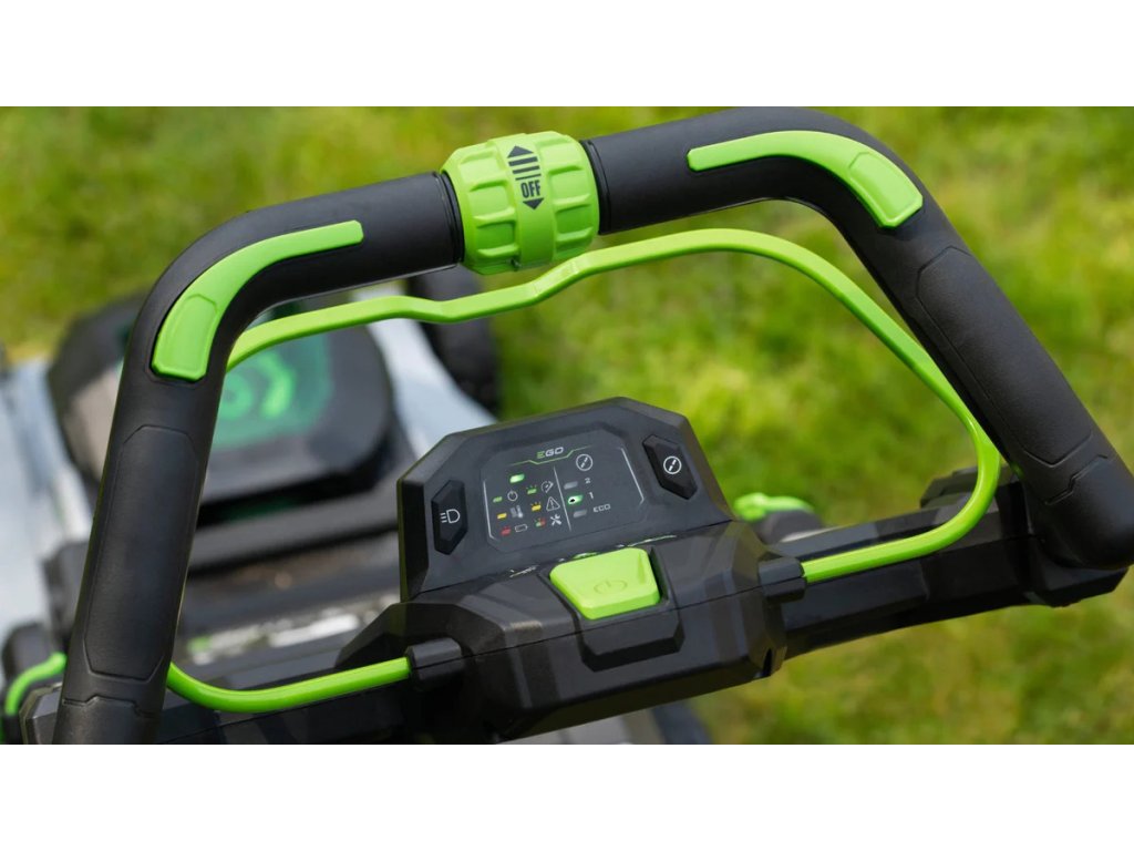 Interaktívny LED ovládací panel: Toto je revolúcia v ovládaní. Priamo na rukoväti nájdete nový displej, ktorý vás v reálnom čase informuje o stave kosačky a kapacite batérie. Čo je však najdôležitejšie – umožňuje vám zvoliť si jednu z 3 rýchlostí otáčok noža.